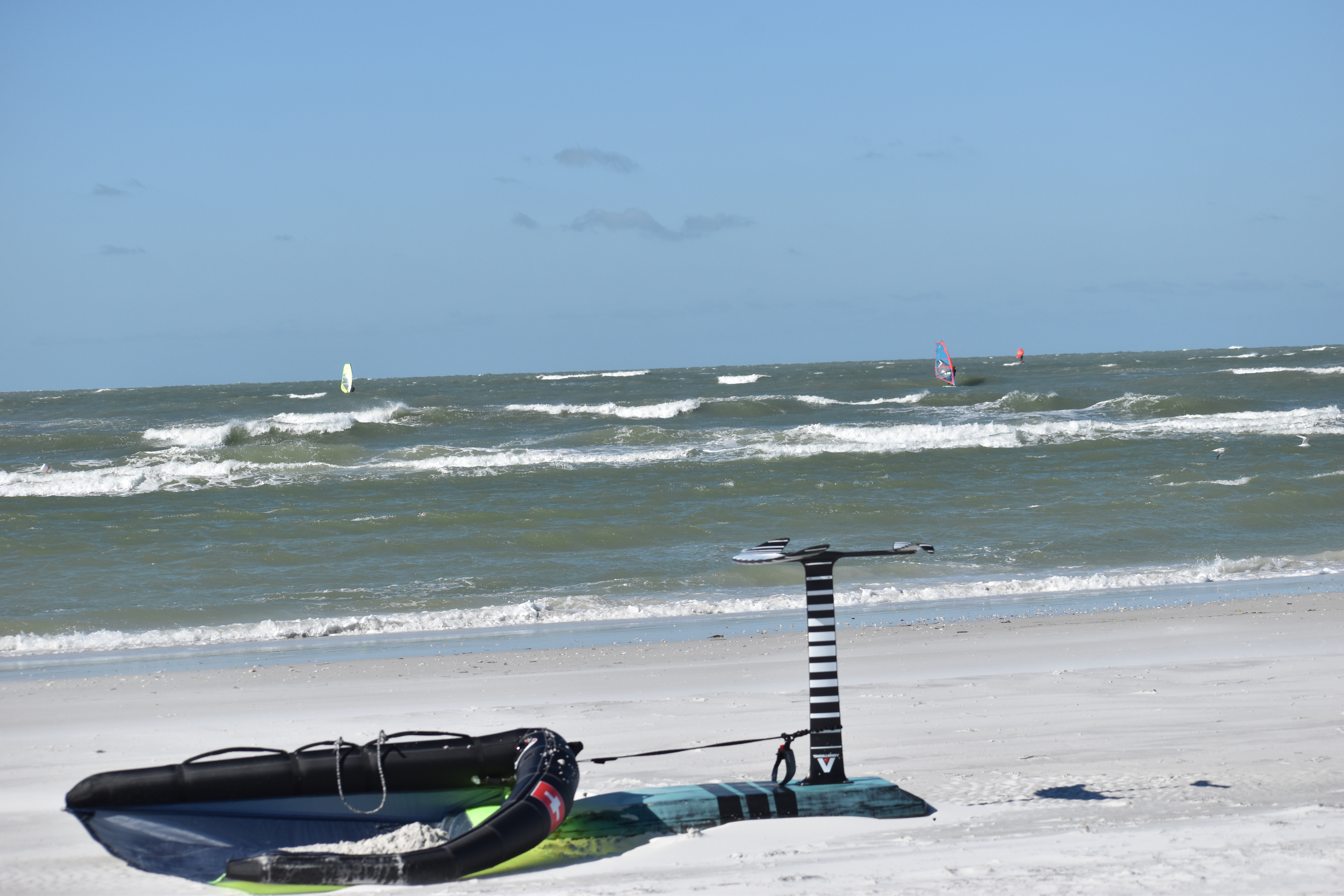 North Beach is a favorite location for Wave and Foil Windsurfing. It is the Gulf of Mexico so deep water everywhere. Don’t sail into the Swimming Areas! These are clearly marked and the lifeguards will react negatively if you sail into these areas. Just be careful as there might be lots of folks, including children swimming near the beach.